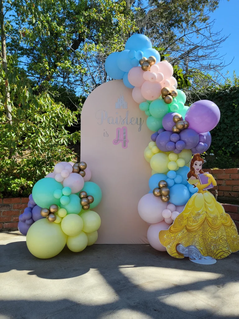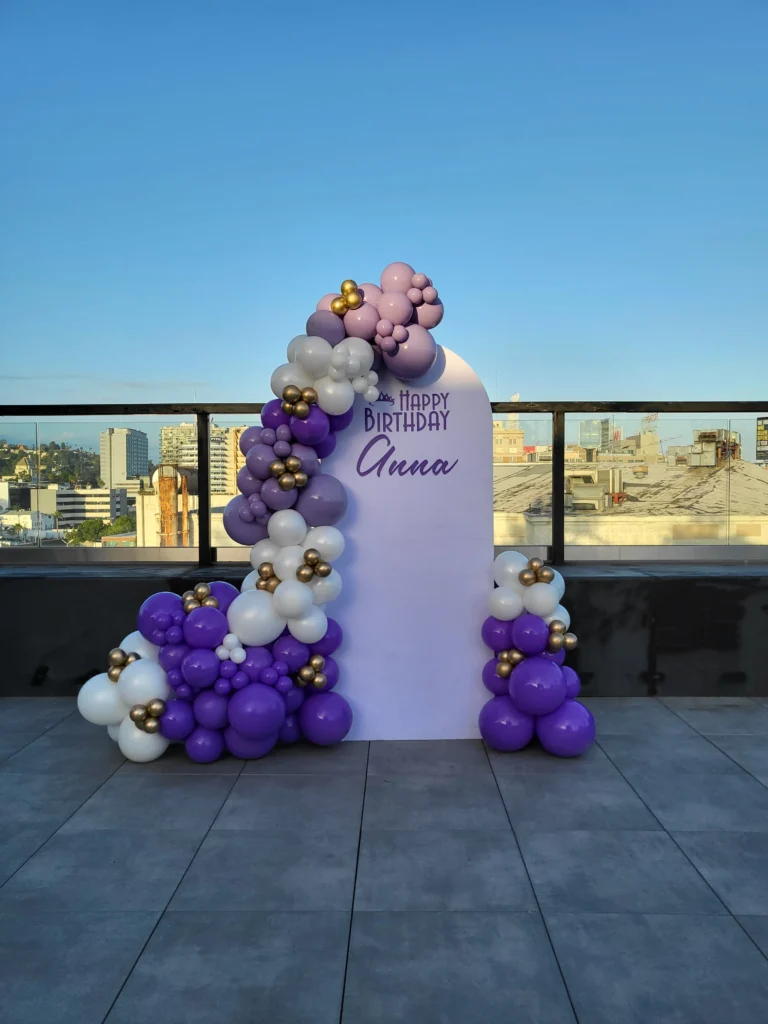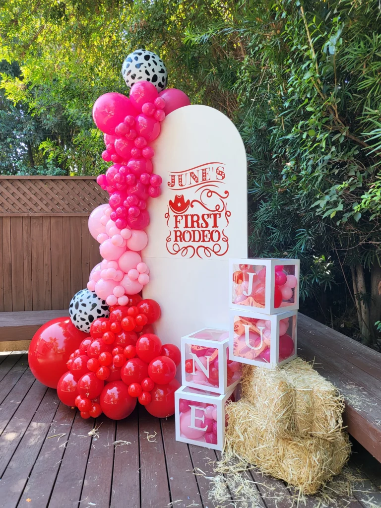 7 feet wooden backdrop with custom lettering, 15 feet balloon garland and specialty balloons